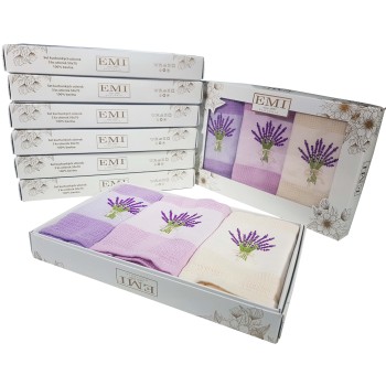 Șervețelele de ceaibrodate din bumbac cu motiv de lavandă sunt ambalate într-o cutie cadou. Dimensiunea unui șervețel este de 43x57 cm.