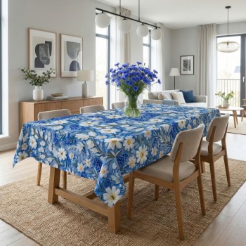 Fața de masă Florina va aduce prospețime și eleganță setului dvs. de masă datorită fondului său albastru frumos și imprimeului floral detaliat. Fabricată din poliester 100% durabil, este ușor de întreținut, se usucă rapid și își păstrează culorile și forma pentru o perioadă lungă de timp. Ideală pentru utilizarea zilnică, precum și pentru aranjarea decorativă a locurilor în bucătărie, sufragerie sau pe terasă.