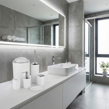 Setul de baie alb din 6 piese este fabricat din material de înaltă calitate. Include coș de gunoi, cană, suport pentru periuța de dinți, săpunieră, dozator de săpun lichid și perie de toaletă cu suport.